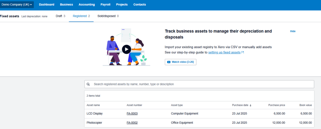 In Xero, both tangible and intangible assets are managed through the Fixed Asset Register, following the same process and depreciation schedule.